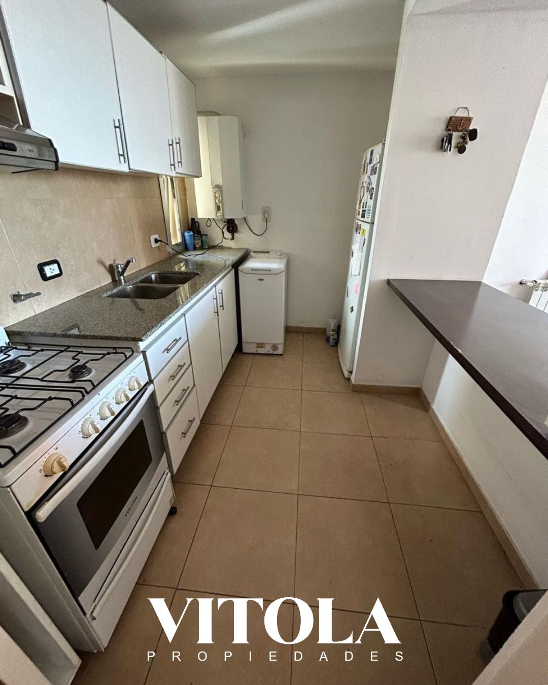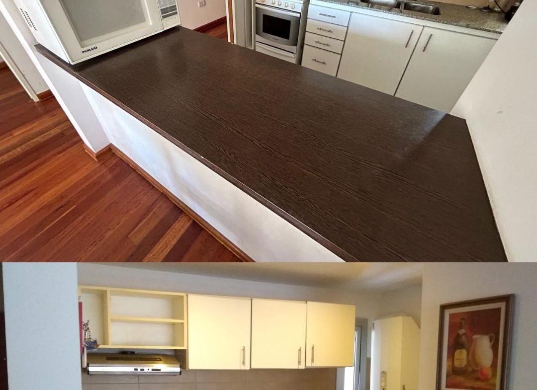 -COCINA SEMI INTEGRADA SEPARADA POR BARRA DESAYUNADORA.